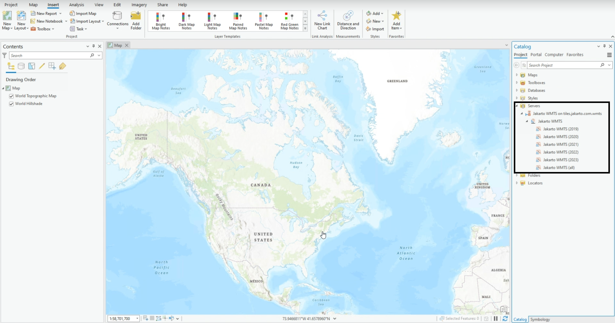 If the Catalog panel is missing from the screen, please add Jakarto's tile data from the View menu > Catalog View > Servers > Jakarto WMTS.