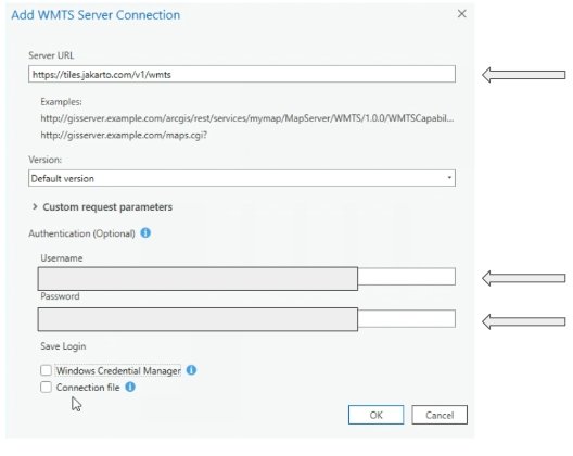 <figure><img src="https://3485357749-files.gitbook.io/~/files/v0/b/gitbook-x-prod.appspot.com/o/spaces%2FvCHiX8A669iM911WAPpm%2Fuploads%2Fgit-blob-399b902b5eb06b3c63f8e409c3b125ae90aabcf3%2Farcgis-pro-wmts-server-connection.png?alt=media" alt=""><figcaption><p>WMTS Server Connection in ArcGIS Pro</p></figcaption></figure>